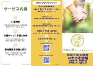 | 事業所名 | つなぐ手ケアマネセンター (いわき事務所) |